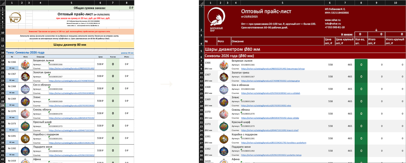 Мастерская работает в сегментах B2C и B2B, последние нередко медлительны и слабо восприимчивы к переменам. Даже сделав возможным заказ через удобный каталог на сайте, им привычнее иметь дело с Эксель-таблицей. Что ж, наша задача — сделать работу с Винтажным шаром по-настоящему удобной, поэтому клиенты получили свою таблицу с автоматическим определением категории клиента и размера его скидки: